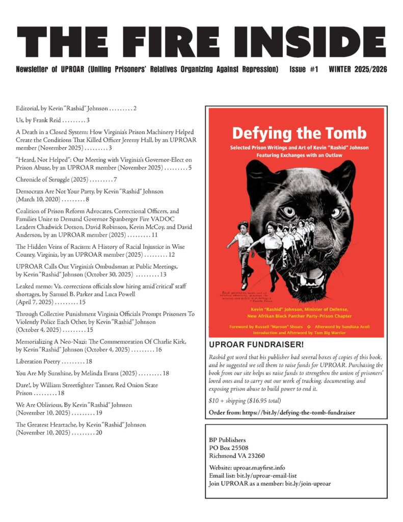 You are here: Home › Publications › The Fire Inside #1 ← REACH INSIDE AND TOUCH SOMEONE: ANSWERING OFFICIAL LIES ABOUT CELLPHONES IN PRISONS (2025) by Kevin “Rashid” Johnson The Fire Inside #1 Download The Fire Inside #1, newsletter of UPROAR print Leave a Reply Cancel replyYour email address will not be published. Required fields are marked *Comment * Name * Email * Website Save my name, email, and website in this browser for the next time I comment. Δ